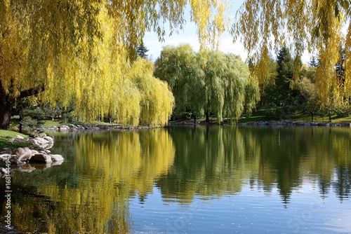 © Галя Дорожинська, Fototapeta premium Pond surrounded by vibrant autumn trees in a tranquil park Generative AI