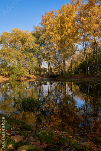Fototapeta premium Pond surrounded by yellow trees in afternoon.