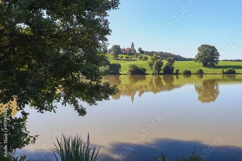 © Jaroslava, Fototapeta premium pond with a church on a hill