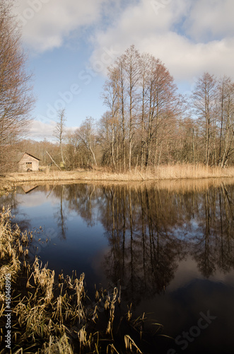 © Bargais, Obraz premium Pond with reflection on a sunny spring day.