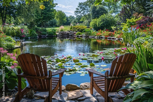 Fototapeta premium Pondside seating in a stunning garden setting.