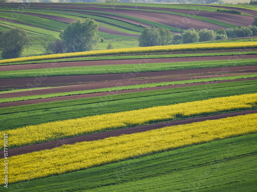 © filozofgrecki, Fototapeta premium Ponidzie - Polska toskania. Wiosna na polach, rzepak. Kolorowe pola - szachownica.