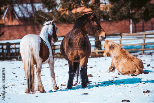 © maywhiston, Obraz premium Ponies and horses Rolling and Playing in the Frosty Snow in the Field on a Sunny day