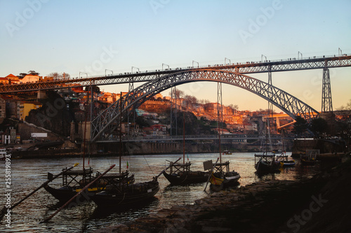 Fototapeta premium ponte luis i bridge in porto, portugal, at sunset with blue sky and port wine boats in foreground