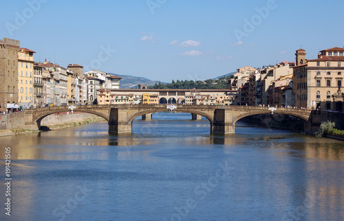 Fototapeta premium Ponte Santa Trinita and Ponte Vecchio over the Arno River in Florence - Tuscany, Italy