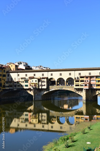 © JB, Naklejka premium Ponte Vecchio and Arno River with blue sky and water reflection. Florence, Italy.