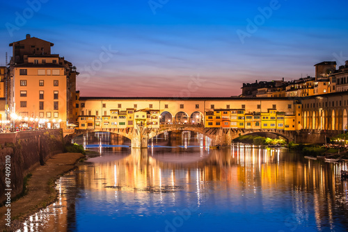 Fototapeta premium Ponte Vecchio bridge and Arno river waterfront in Florence evening view