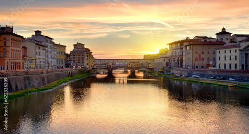 Naklejka premium Ponte Vecchio on the river Arno in Florence at sunrise, Italy