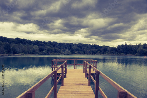 Naklejka premium ponton de pêche sur le lac de Virieu le grand dans l'ain un jour d'orage