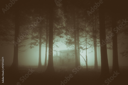 © mimadeo, Fototapeta premium ponury las z mgłą i domem