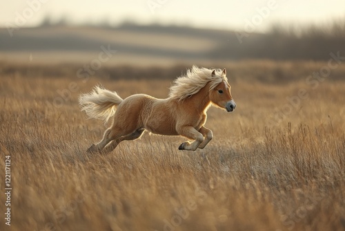 © BrandwayArt, Obraz premium Pony galloping freely across golden grassland at sunset