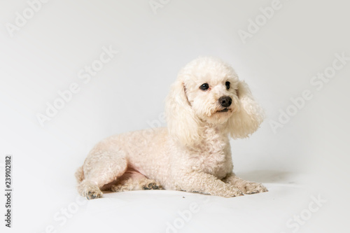 Fototapeta premium poodle dog lying on a white background studio