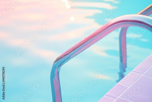 © Alexandr, Naklejka premium Pool ladder with pink hues on shimmering water under sunlight