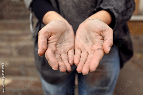 Fototapeta premium Poor homeless woman begging for help outdoors, closeup