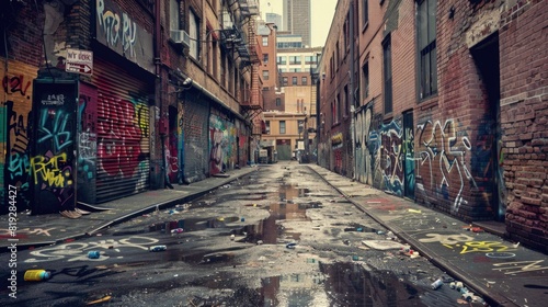 Fototapeta premium Poor neighborhood, walls covered in graffiti, dirty street