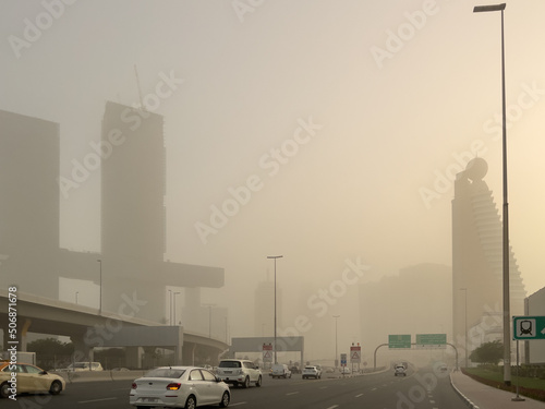 © MalcStock, Naklejka premium Poor visibility during a sandstorm in the city