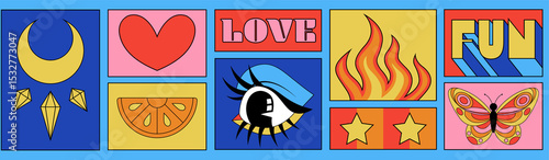 © vectorfusionart, Naklejka premium Pop-art collage showing flat icons of moon, heart, LOVE, flames, FUN on transparent background