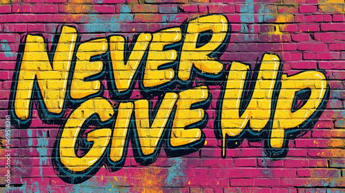 © Furkan, Fototapeta premium Pop art comic street graffiti with Never Give Up text on brick wall. Social protest and action background poster.