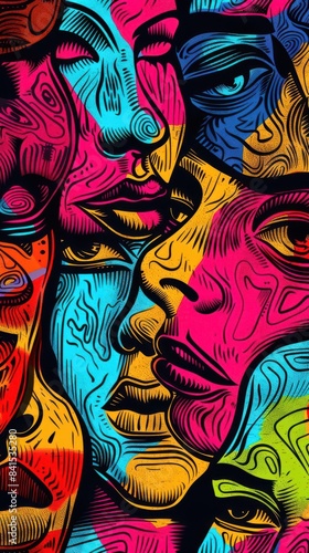 © Kanyakarn, Naklejka premium Pop Art Faces Repeated faces in different bright colors with bold outlines, Super cool and nice background, realistic photo stockphoto style