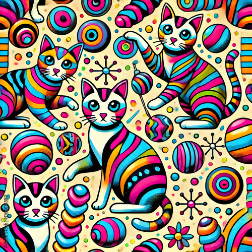 © Yosich1961, Fototapeta premium Pop Art illustration of playful cats with bold, colorful spring toys in vibrant neon colors