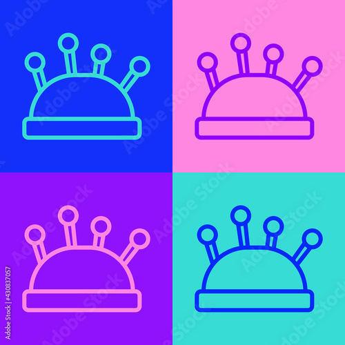 © Kostiantyn, Obraz premium Pop art line Needle bed and needles icon isolated on color background. Handmade and sewing theme. Vector