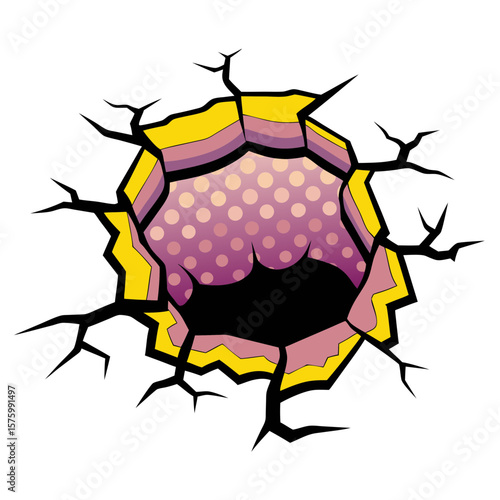 Fototapeta premium Pop art style comic book illustration of a cracked wall hole, isolated vector...