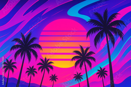 © foto Art, Naklejka premium Pop art vaporwave background with glowing sunset gradients in neon purple electric pink and teal blue, comic inspired abstract design featuring palm tree silhouettes for dreamy futuristic wallpaper