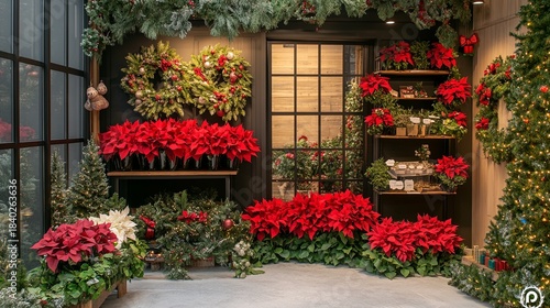 Fototapeta premium Pop-up Christmas flower shop with poinsettias and pine wreaths .