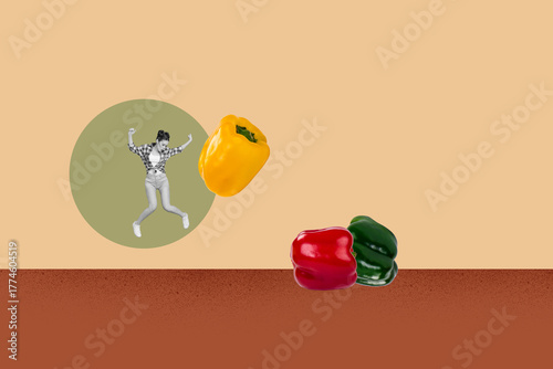Naklejka premium Pop zine 3d image collage of happy girl guy stand red yellow green pepper bulgarian paprika plate detox nutrition dinner vitamin