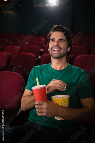 © WavebreakMediaMicro, Fototapeta premium Popcorn tub and disposable cup sitting on red cushioned theater seats, under soft projector glow