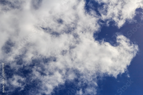 © Olga Soloveva, Obraz premium Poplar fluff flies against a bright blue sky and white clouds in the sunlight