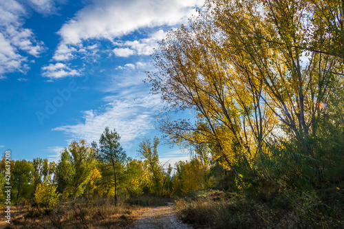 © Pablo Eskuder, Obraz premium Poplar forest with yellow leaves in autumn.