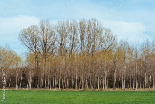 Obraz premium Poplar, Populus nigra. Plantation of poplar trees at spring time