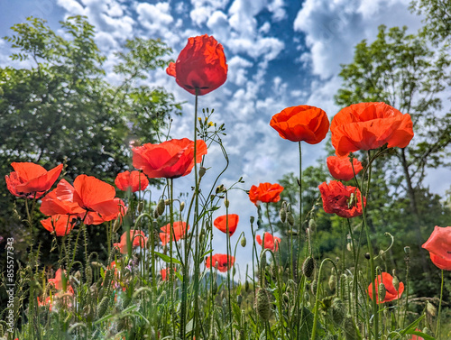 © Sandra Alkado, Obraz premium Poppies (corn poppy) in green grass. Poppy field against a blue sky with clouds