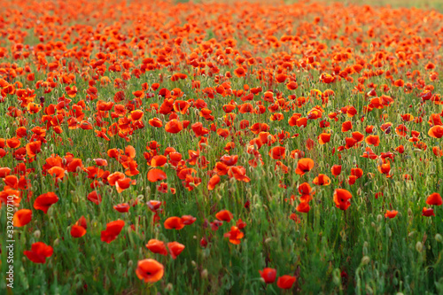 © onphotoua, Fototapeta premium Poppies on green field on summer sunset