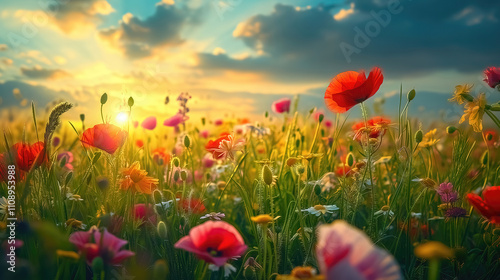 © Cobalt, Fototapeta premium Poppies wildflowers spring landscape, beautiful idyllic rural background