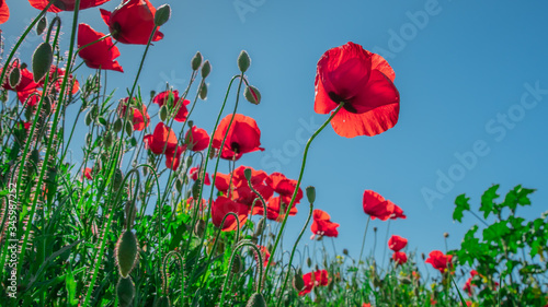 © Nicolas VINCENT, Obraz premium Poppy and buds in a field with blue sky in the background with selective focus. Close-up view from below. Lonely poppy.