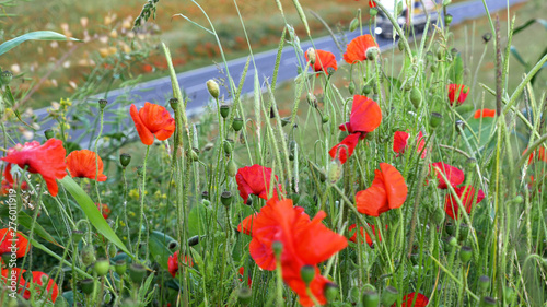 © Jevanto Protography, Obraz premium Poppy field over uk motorway traffic on background