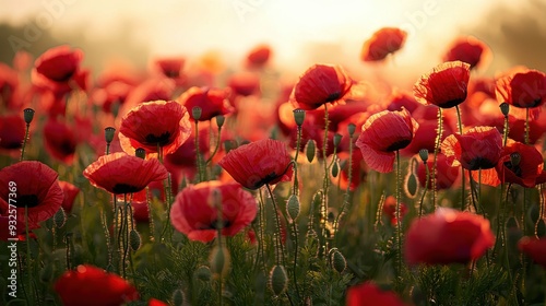 Fototapeta premium Poppy Field Sunset Landscape with Red Flowers and Golden Light