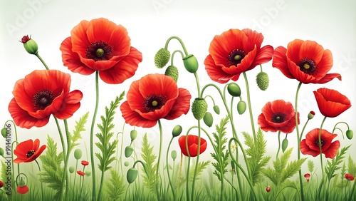Obraz premium Poppy Fields: A Symphony of Crimson and Green Generative AI