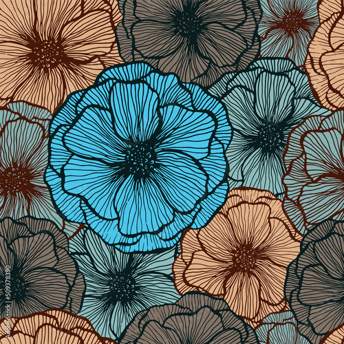 © SunwArt, Naklejka premium Poppy flower doodle floral vector seamless pattern summer fabric print design. Line texture petals