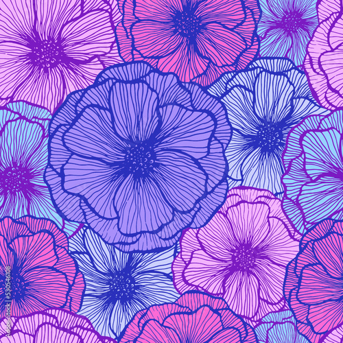 © SunwArt, Naklejka premium Poppy flower doodle floral vector seamless pattern summer fabric print design. Line texture petals