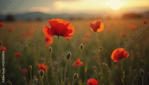 © Natallia, Fototapeta premium Poppy flowers blooming in sunset field, Poppy field, Blooming fields