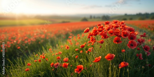 Naklejka premium Poppy flowers in a spring landscape illustrating seasonal bloom and natural renewal, spring floral scenery
