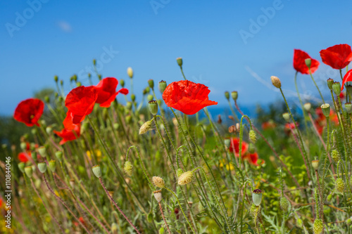 © victoriamende, Obraz premium Poppy flowers near the sea