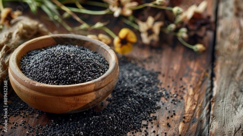 © PaulShlykov, Fototapeta premium Poppy seeds in small wooden bowl on dark table. Poppies head on board with backlight.
