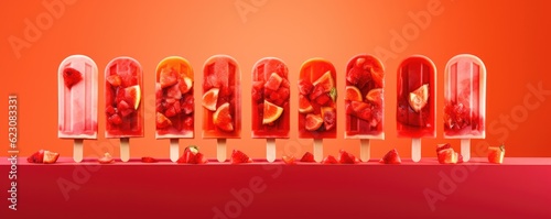 Fototapeta premium Popsicles of fresh and healthy watermelom on red background, panorama. Generative Ai.