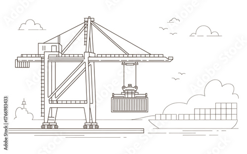 Fototapeta premium Port Crane Lifting Container on Ship Line Art vector