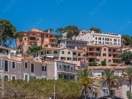 Obraz premium Port de Soller, Mallorca hillside town with colorful real estate buildings,...