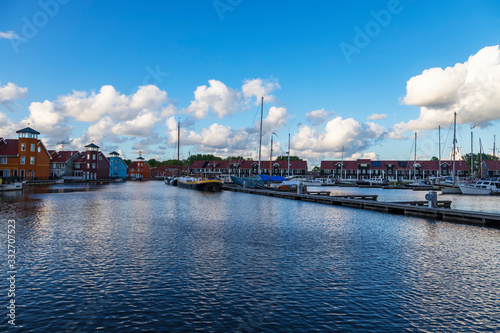 © Roman Bjuty, Naklejka premium Port in Groningen city in Holland. The background is a blue sky with white clouds.